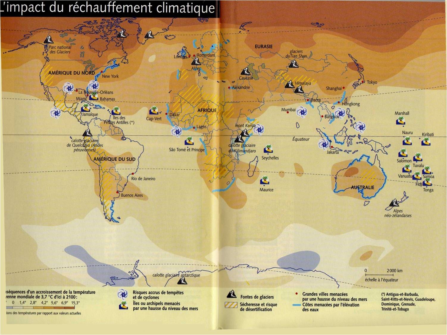 La montée des eaux des mers et océans est une conséquence essentielle de ce changement cartographique : certaines îles sont vouées à disparaître, ainsi que des pays, des villes (Doc2) et donc de nombreuses côtes (Doc1).